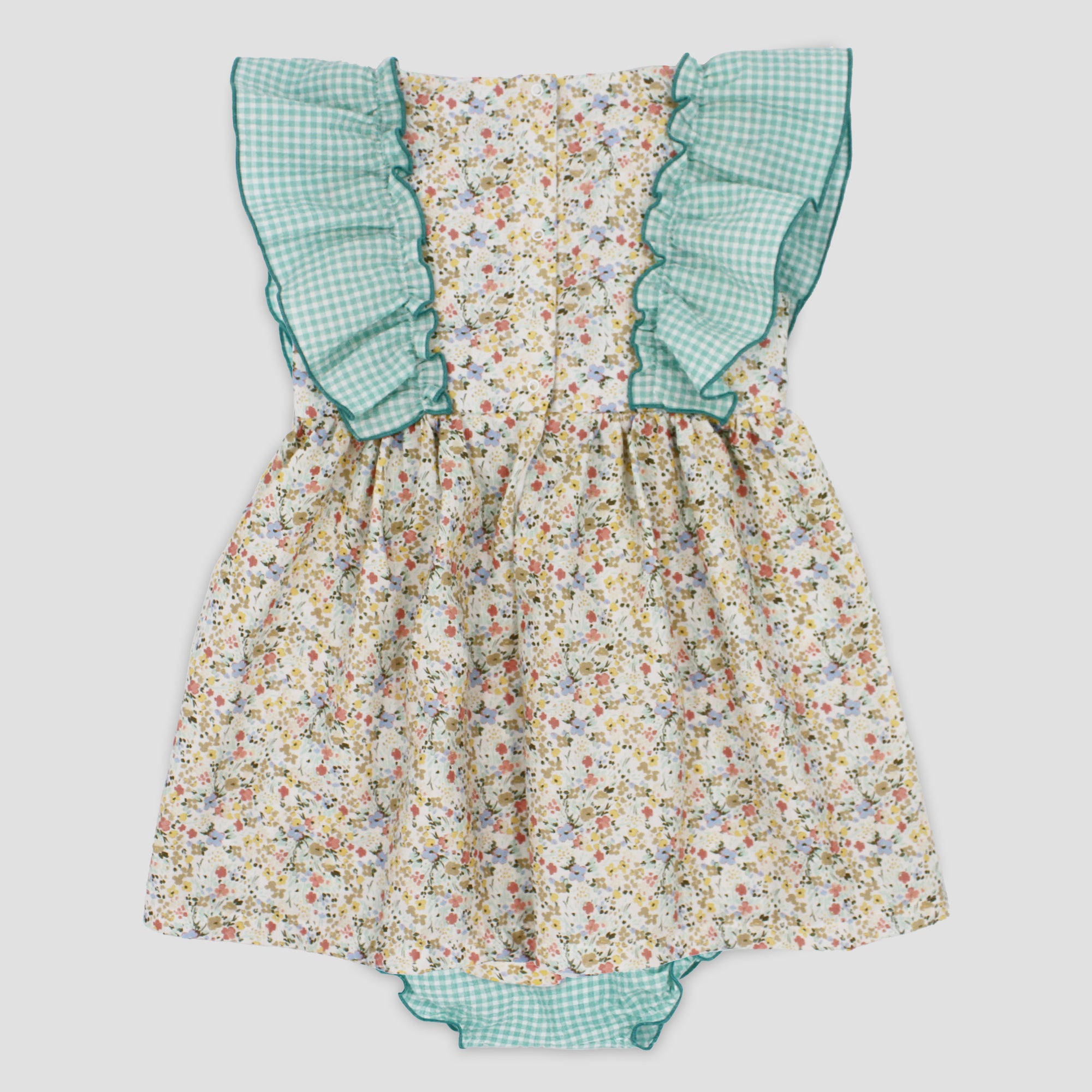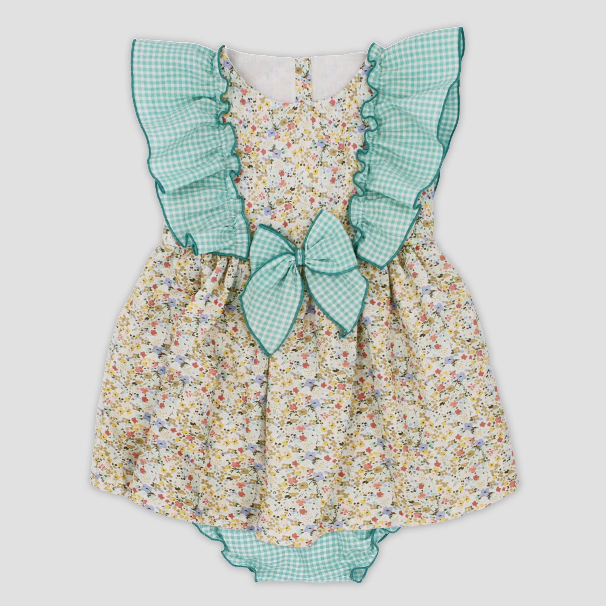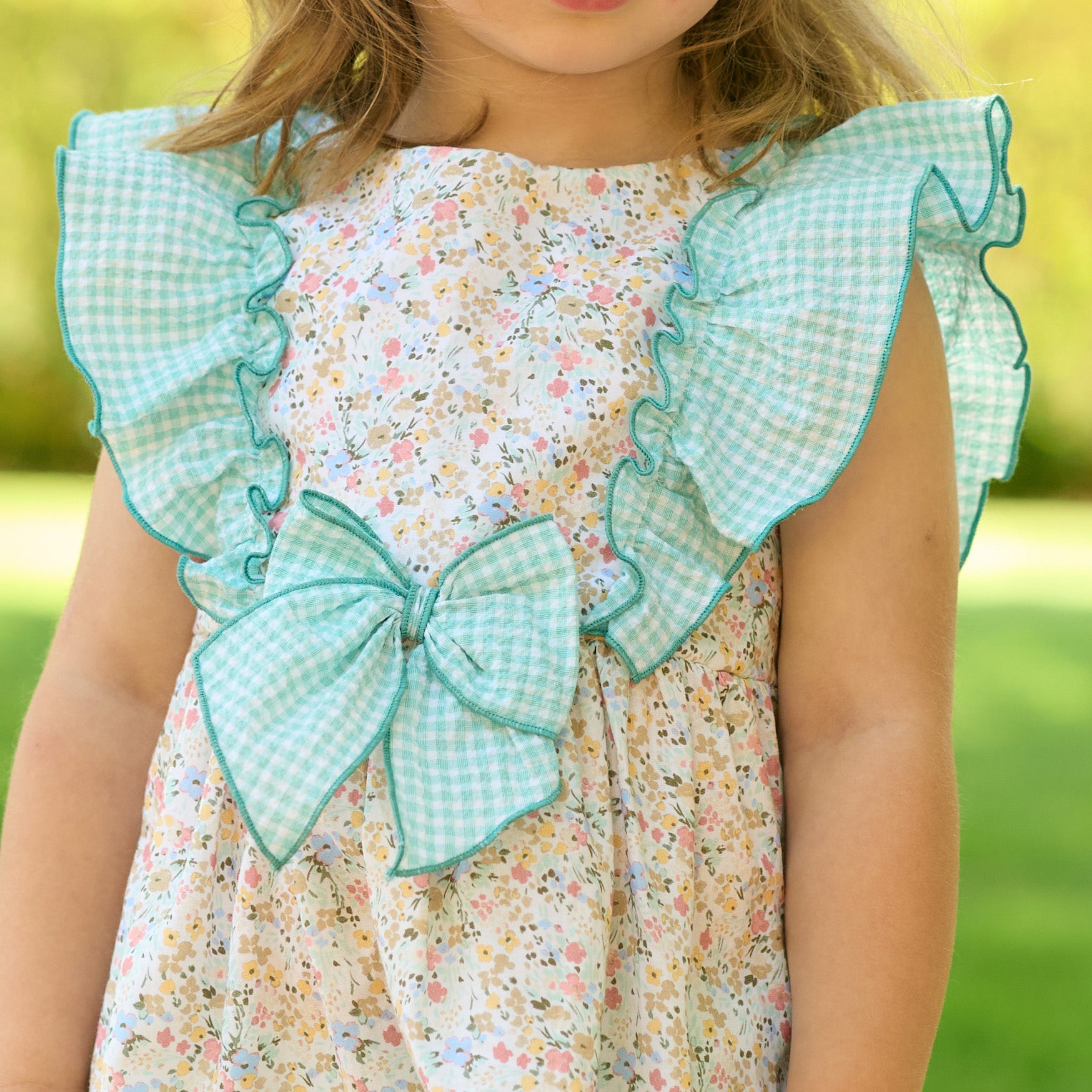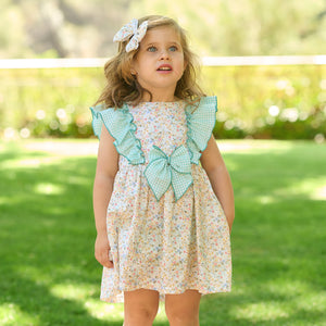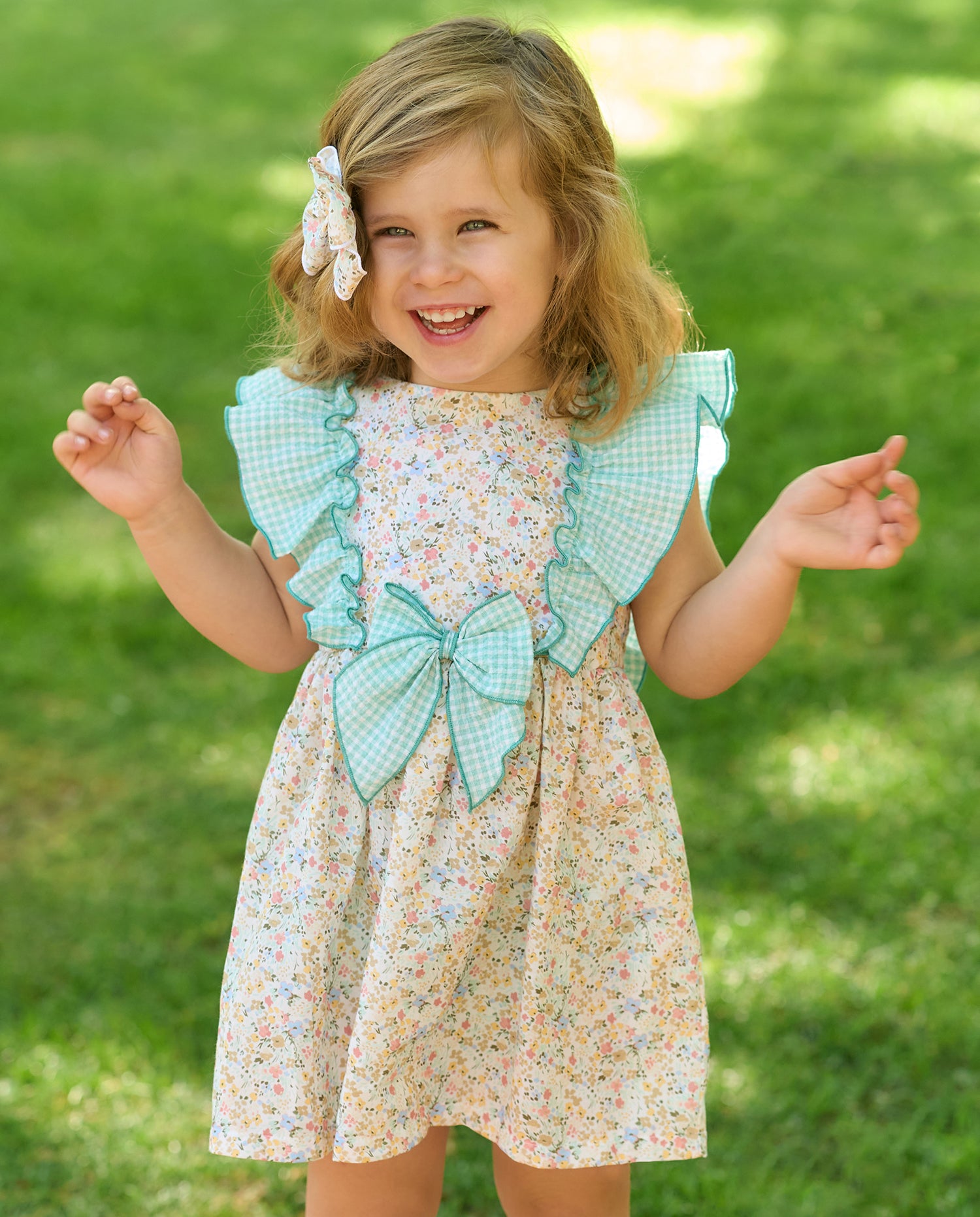 Stunning dress from Spanish brand Rapife. Made in a soft ditsy print cotton the dress features gorgeous deep ruffle sleeves in a contrasting green and white seersucker gingham, a large bow to the waistband completes the look. Popper fastens at the back.