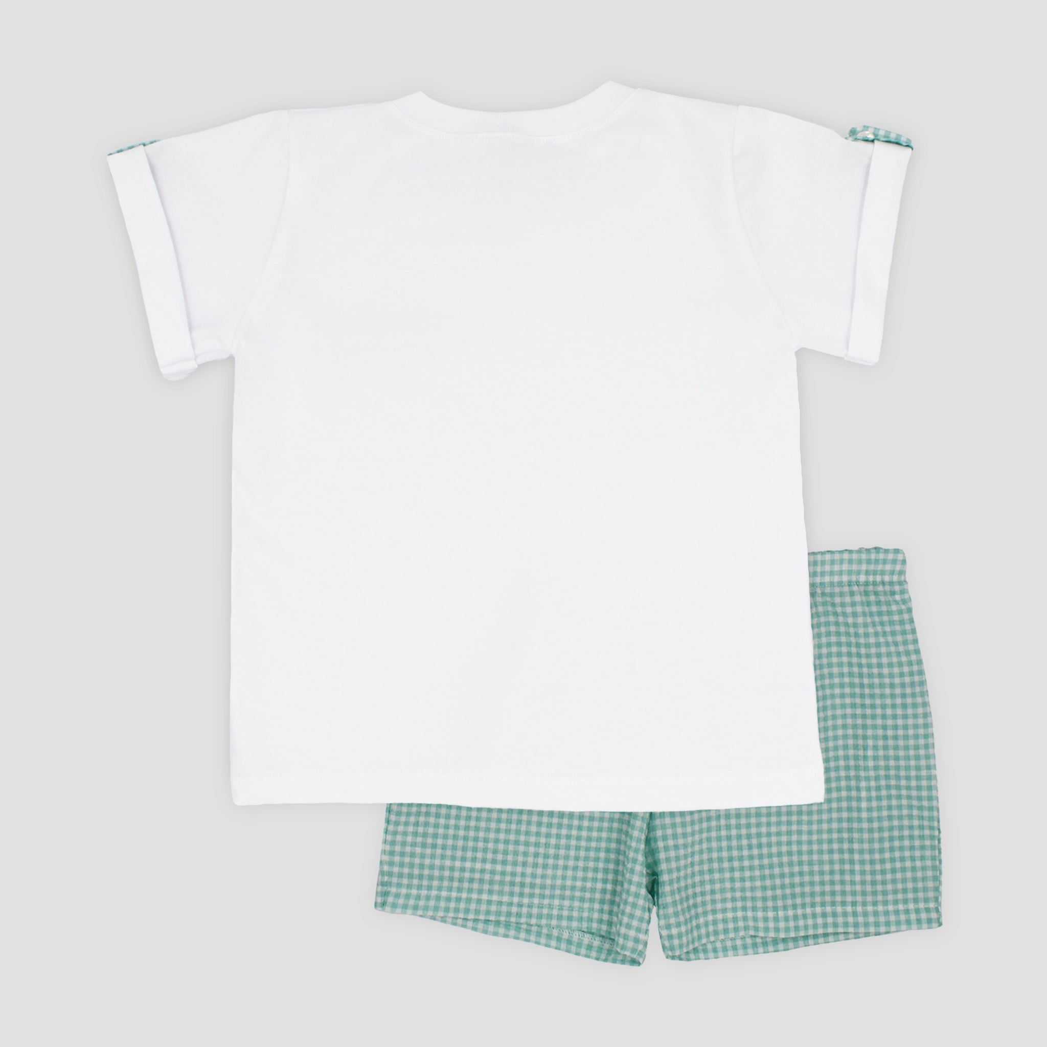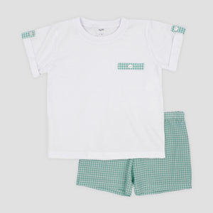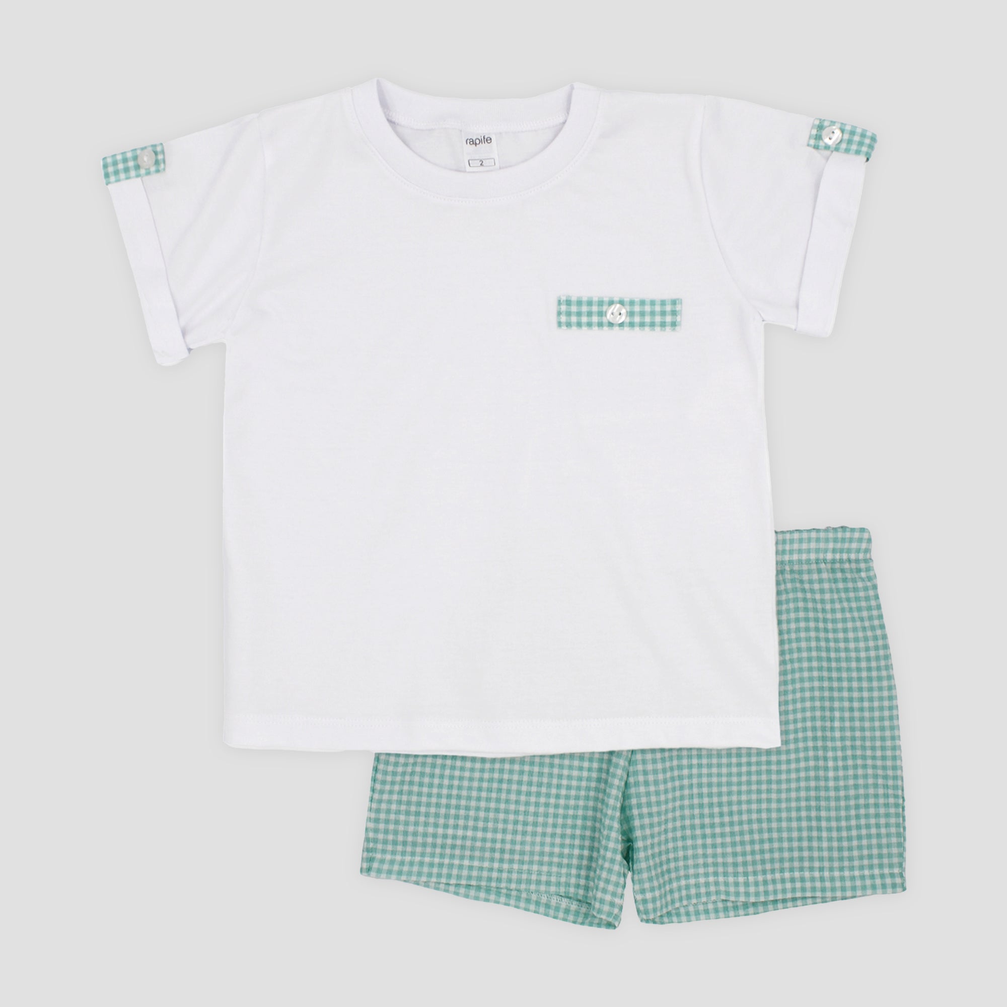 Classic shorts set from Spanish brand Rapife. The white soft feel cotton t-shirt features a faux button timed pocket to the front, turn-up sleeves with green gingham button fastenings and matching green gingham shorts with an elasticated waistband. Fit: True to size (e.g. 12 months = 9-12 months)Composition: 100% cotton Care: Machine Washable (30 degrees) Brand: Rapife