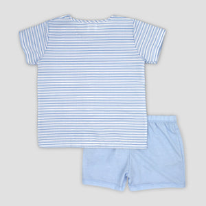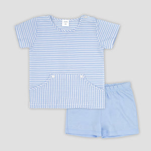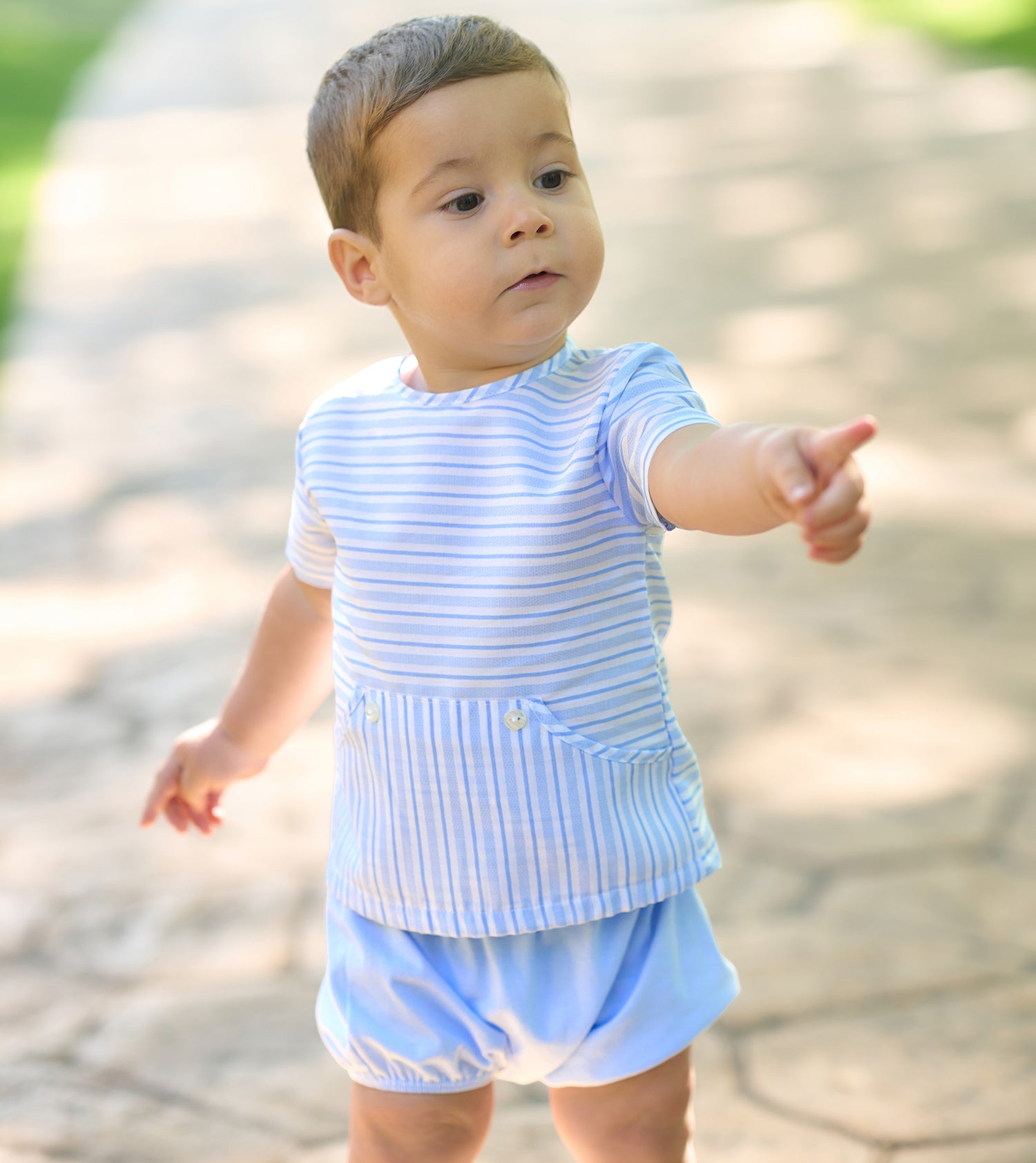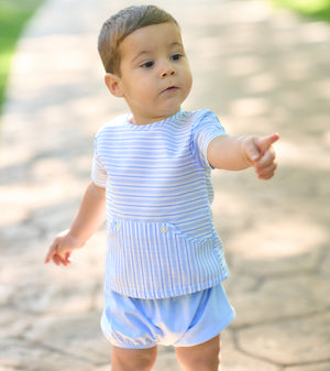 Smart short set for older boys from Spanish Brand Rapife. The top is a sky blue and white horizontal pinstripe with a large patch pocket to the front of the top, white pearlised button trims add lovely detailing. The shorts are a blue jersey cotton with an elasticated waistband. Top button fastens at the shoulder.