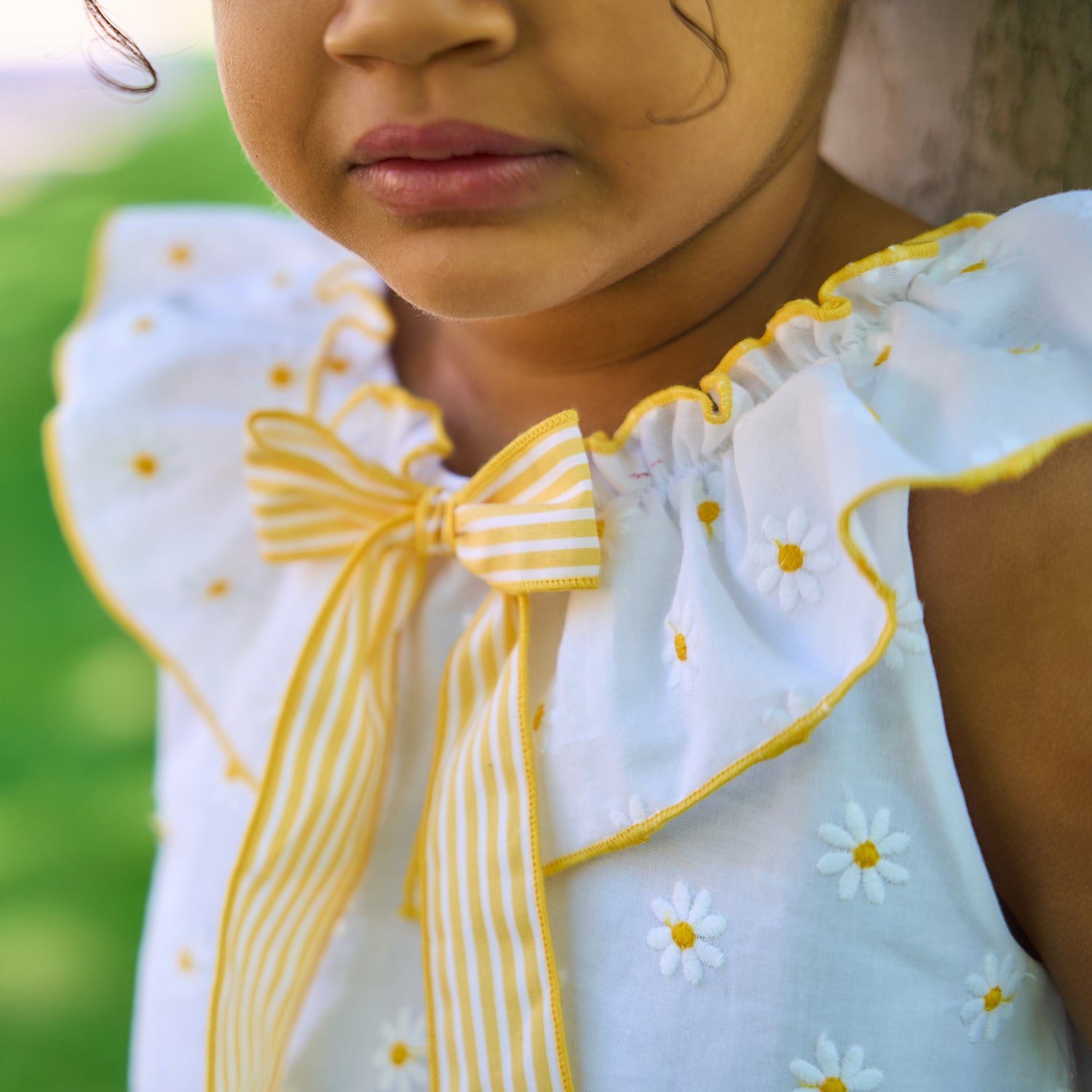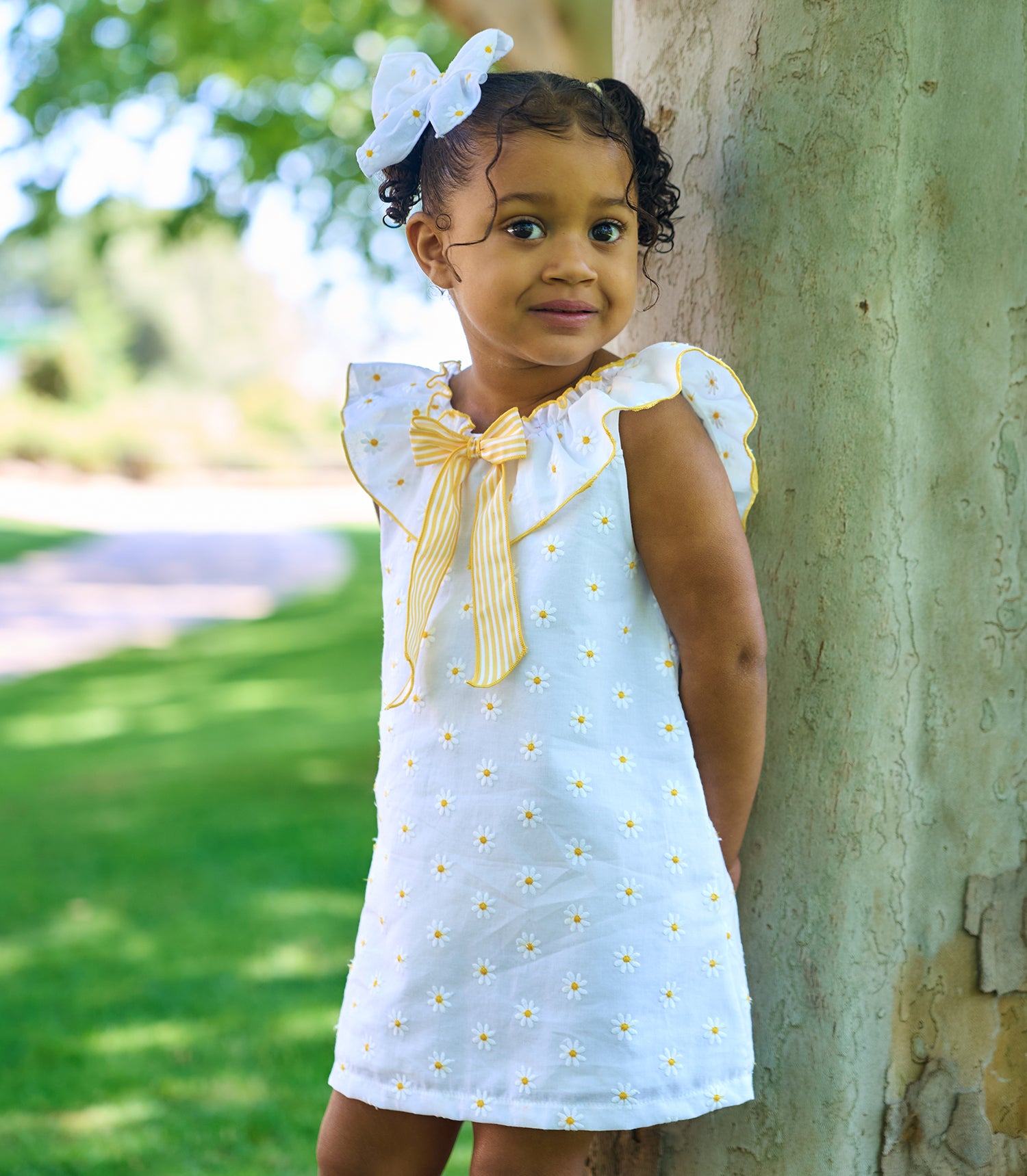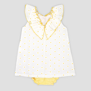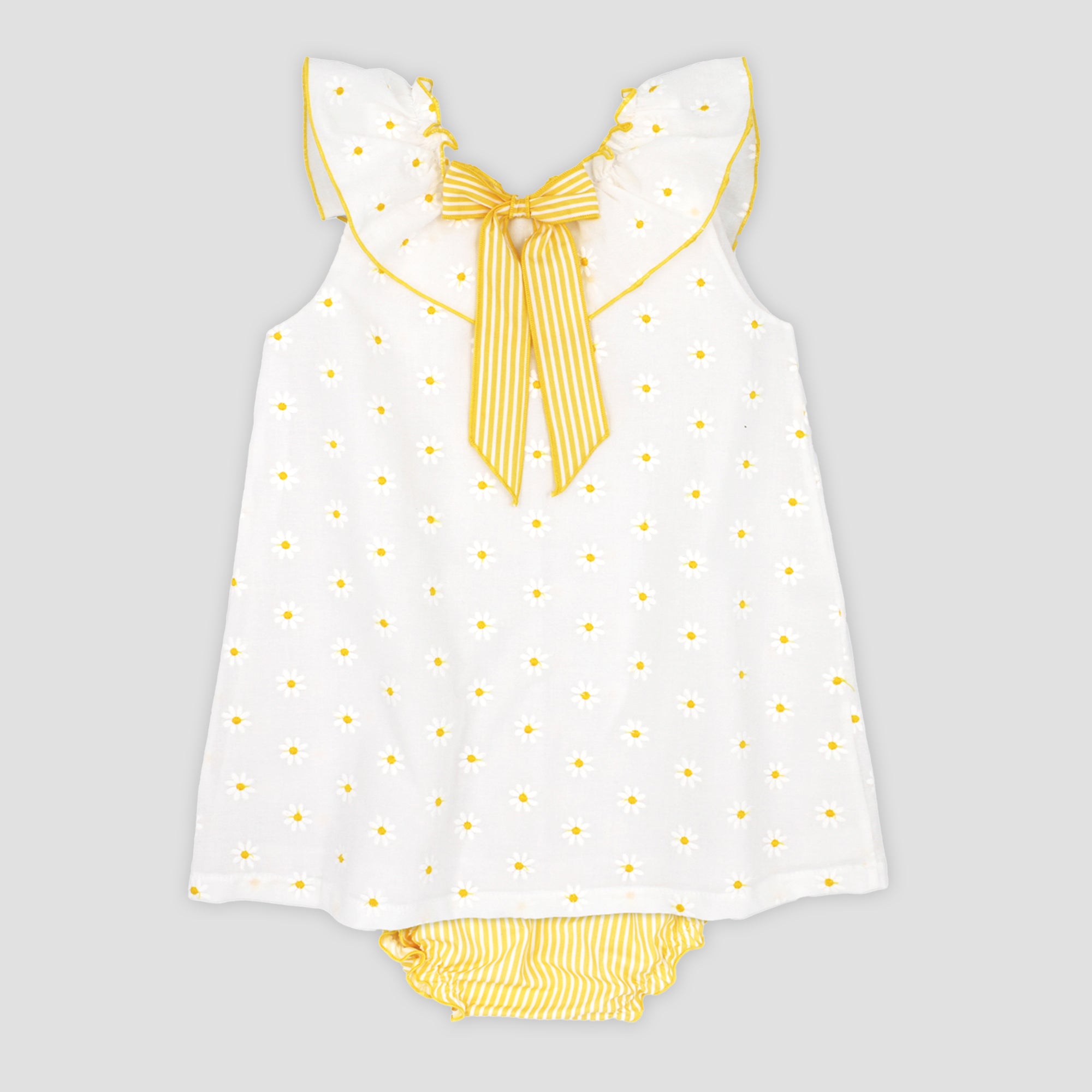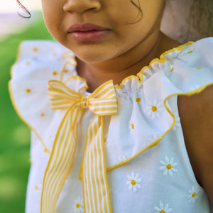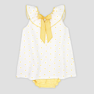 Gorgeous summer dress from Spanish brand Rapife. Made in a soft feel white cotton the dress is covered in sweet embroidered daisies, a pretty ruffle collar trimmed with a large yellow and white striped cotton bow completes the look. Dress popper fastens at the back.PLEASE NOTE SIZES 4 UPWARDS COME WITH NO PANTS Fit: True to size (e.g. 12 months = 9-12 months)Composition: 100% cotton Care: Machine Washable (30 degrees) Brand: Rapife