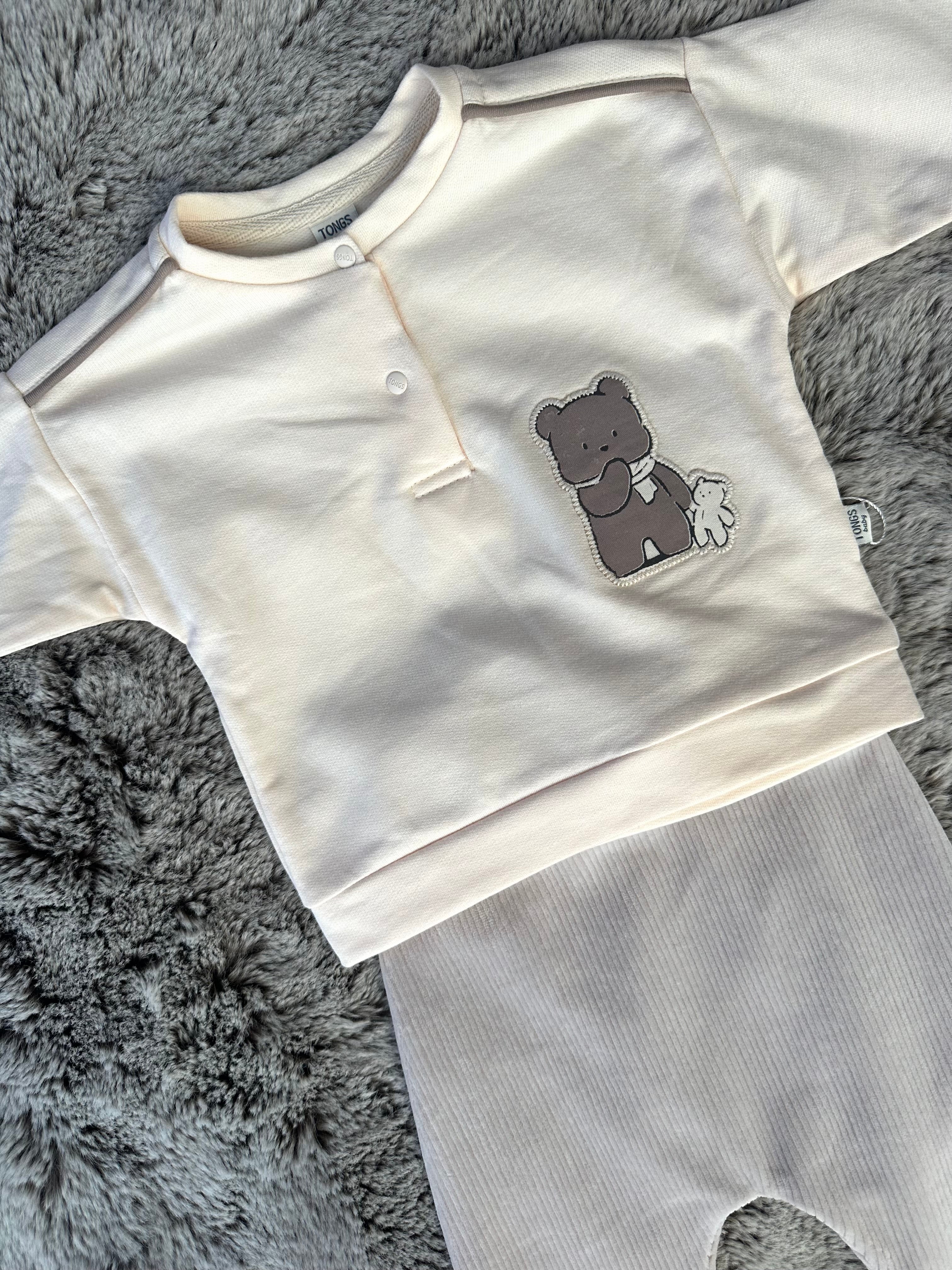 CuCute set by Tongs Baby, the sweatshirt is a light beige cotton with a soft fleecy inside, brown stripes to the shoulders and a teddy bear applique motif to the front add lovely detailing. Top popper fastens to the front. The trousers are a soft brushed cotton corduroy with turn-up leg cuffs and an elasticated waistband for comfort.